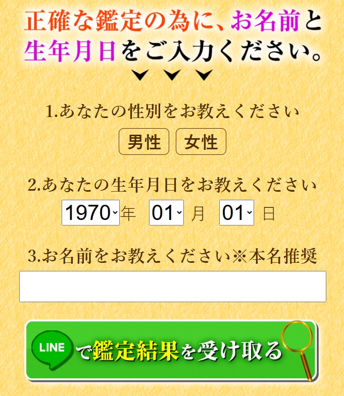 ②サイト内に入って、基本情報【性別、生年月日、名前】を入力後【LINEで鑑定結果を受ける】をクリック!