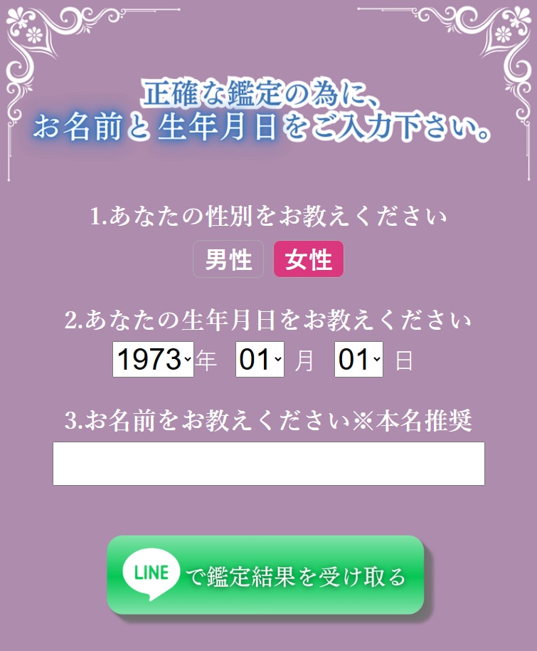 ②サイト内に入って、基本情報【性別、生年月日、名前】を入力後【LINEで鑑定結果を受けとる】をクリック!