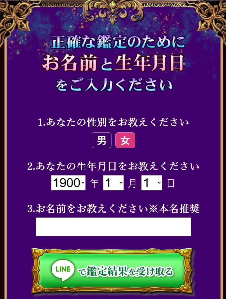 ②サイト内に入って、基本情報【性別、生年月日、名前】を入力後【LINEで鑑定結果を受ける】をクリック!