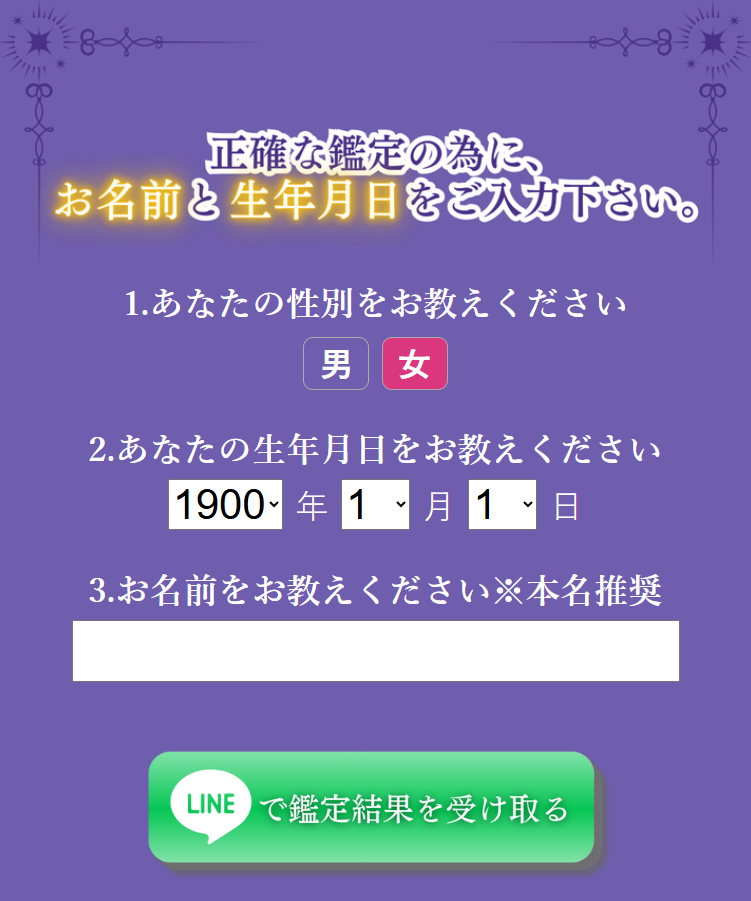 ②サイト内に入って、基本情報【性別、生年月日、名前】を入力後【LINEで鑑定結果を受ける】をクリック!